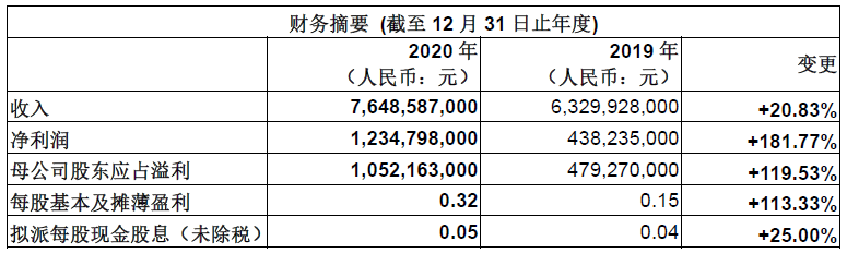 2021年3月24日–公司公(gōng)布(bù)截至2020年12月31日止年度之全年業績。2020年度業績全麵向好,核心指標(biāo)同比大增實現翻倍,每股派發現金紅利人民幣0.05元(稅前)