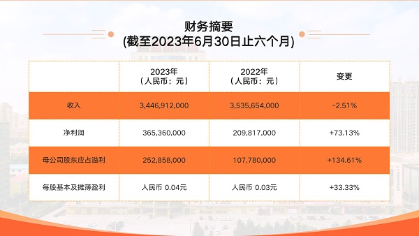 2023年上半年,麵對嚴峻複雜的內外部發展環境以及金(jīn)價高位運行的(de)曆史機遇,公(gōng)司不斷提升風險預判能力,適時把握市場機遇,有效化解(jiě)各種風險和挑戰,取得了來之不(bú)易的(de)發展成績(jì)。2023年上半年,公司實現營業(yè)收入約人民幣34.47億元,較去年同期總體保持平穩;淨利潤增長約74.13%至約人(rén)民幣365,360,000元,母公司股東應占溢利增長約134.61%至約人民幣252,858,000 元(yuán),母公司普通股股東應占(zhàn)每股基本及攤(tān)薄(báo)盈利(lì)增(zēng)長約33.33%至約人民幣0.04 元。