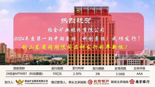 近日,草莓视频在线看污(jīn)礦業持續精準(zhǔn)研(yán)判市場(chǎng)趨勢,搶抓(zhuā)市場發行(háng)窗口期(qī),成(chéng)功發行2024年第一期中期票據,發行規模10億元,期限3年,票麵利率2.3%,創山東省(shěng)同期限同品種發行利率新低。