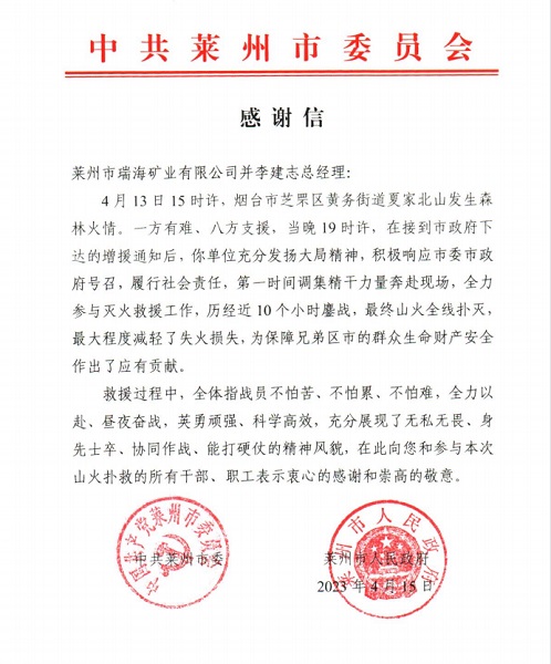 日前,萊州市瑞海礦業有限公司收到了萊州市委市政府送來的感(gǎn)謝信,對企業(yè)積極響應號(hào)召,履行社會責任,調集精幹力量撲(pū)救森林山火做出(chū)的(de)貢獻(xiàn)表示感謝。
