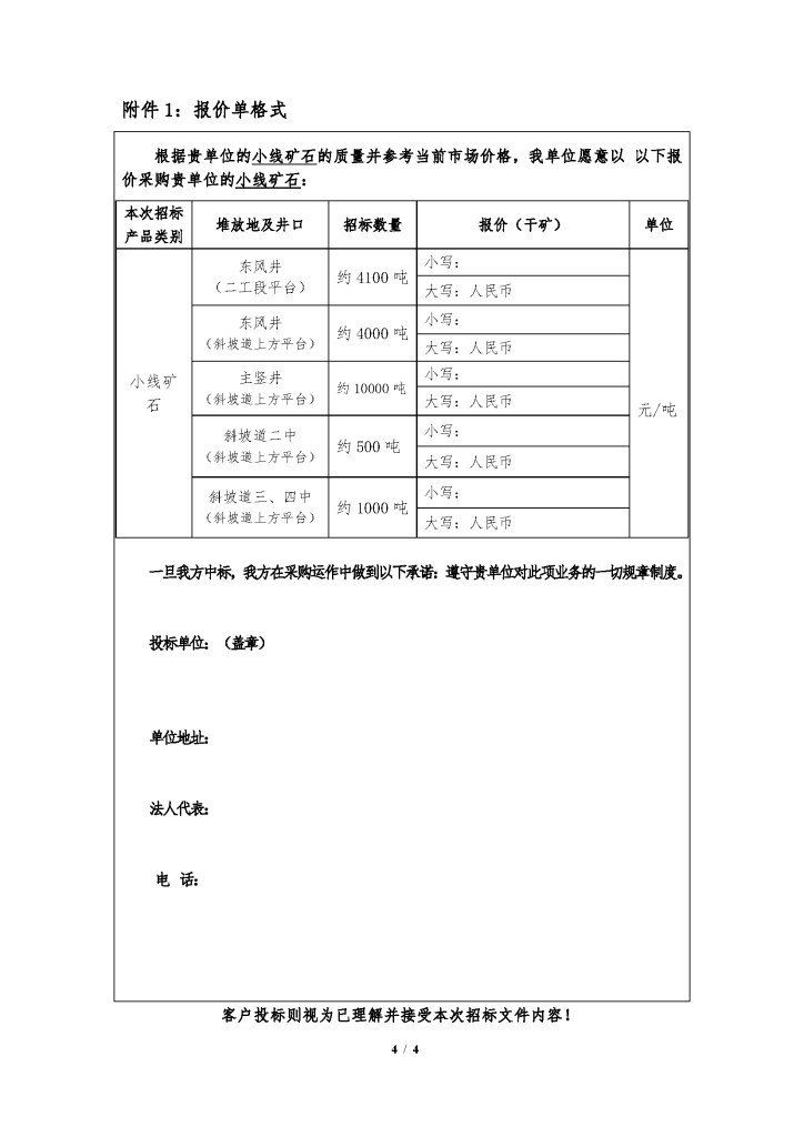 4.如無(wú)異議,請投標(biāo)人將此招標文件和報價(jià)單加蓋(gài)企業公章(zhāng)(或按捺手印)原件掃描後發送至指定(dìng)投標郵箱;報價單所需填寫的數據原則上要求電子版,若手寫須大小寫注明,如有(yǒu)塗改、不(bú)清晰或大小寫不一致的視為廢標。其他未盡事宜,以中(zhōng)標後簽訂的合同(tóng)條款約定為準。