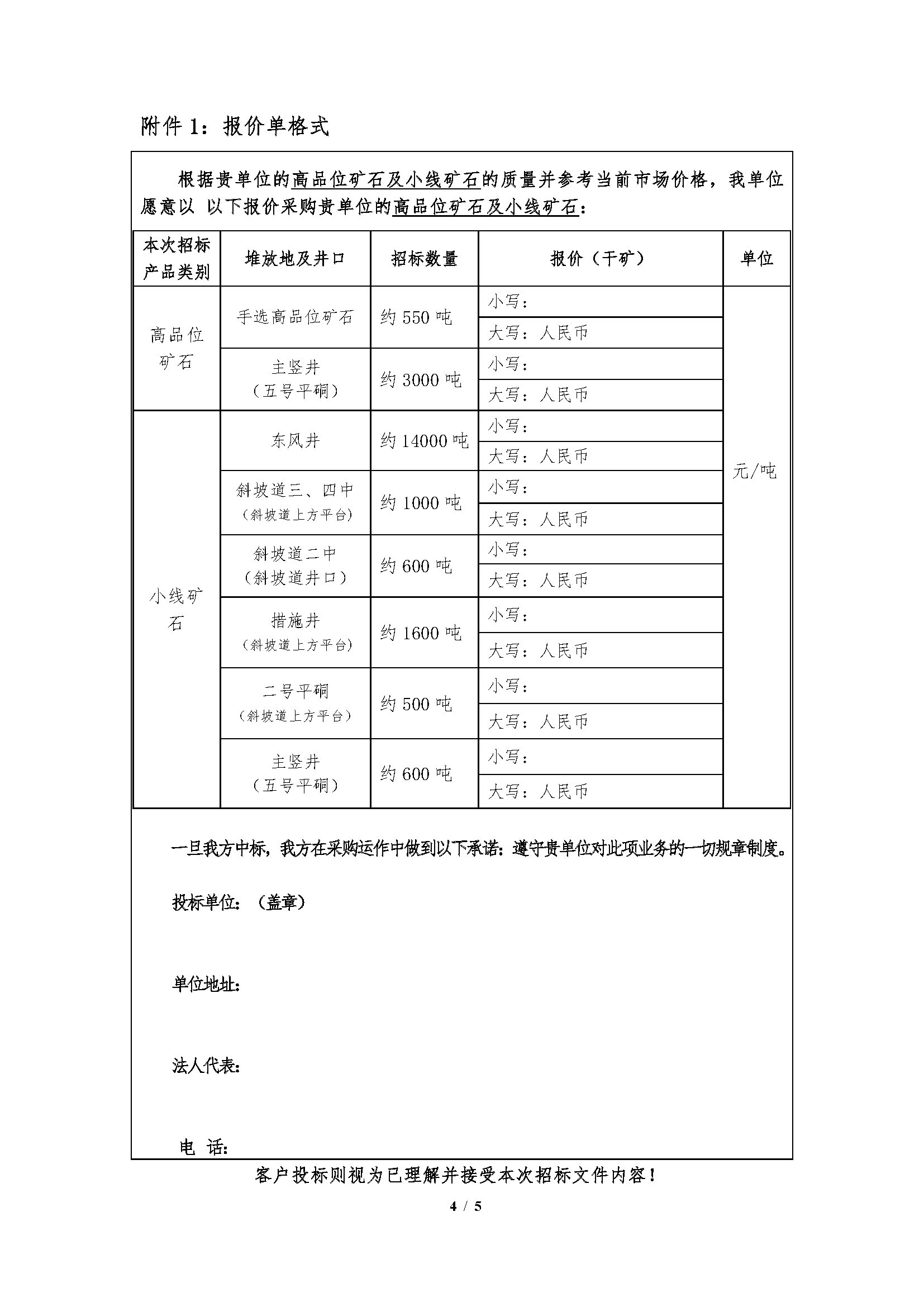 4.如(rú)無異議,請投標(biāo)人將此招標文件和報價單加蓋企業公章(或按捺手印)原件掃描後發送至(zhì)指定投標郵箱;報價單所需填寫的數據原則上要求電子版,若手寫須大小寫注明,如有塗改、不清晰(xī)或大小寫不一致的視為廢標。其他未盡事宜(yí),以中標後簽(qiān)訂的合同條款約定為準。
