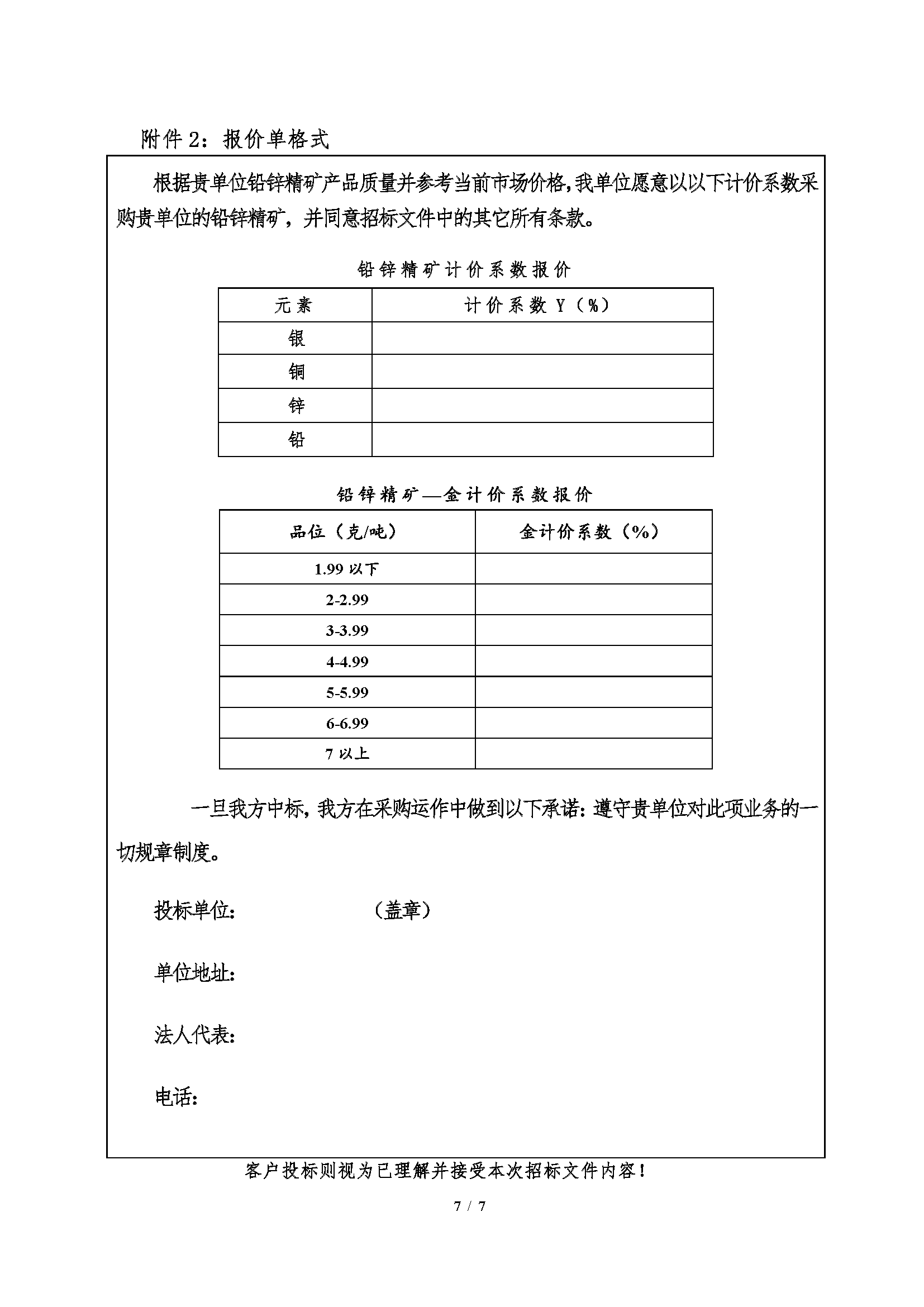2.本次招標為一次性報價,在標書報送截止後(hòu)現場製定底標並在規定時間內進行開標(biāo)。本次招標以我單位檢測(cè)的(de)本批次礦各元素平均(jun1)品位(wèi)對應的報價係(xì)數測(cè)算出綜合單(dān)價,每幹噸礦計算的價值最高者得。