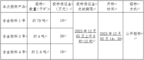 本次招標副(fù)產品為我公司含金物料。投標人(rén)需提供“三證合一”的營業執照(zhào)複印件(個人提供身份證(zhèng)複印件)、法人授權委托(tuō)書(shū)(原件)並加蓋企業公章,於2023年12月04日12:00前將上述材料送交我公司財務科進行審核,審核合格後(hòu)的單位應於2023年12 月 05日上午(wǔ)8時-12時交納投標保證金(見(jiàn)下表(biǎo),保證金須以轉賬方式支付(fù))。如在2023年 12 月 05 日上午12時(shí)前投(tóu)標保證金未足額(é)匯入(rù)我公司賬戶則視為放棄本(běn)次投標;若投標人最終(zhōng)未中標,則由投標人開具收款收據後(hòu),我公司將(jiāng)一次性無息退(tuì)還投(tóu)標保證金(jīn)。