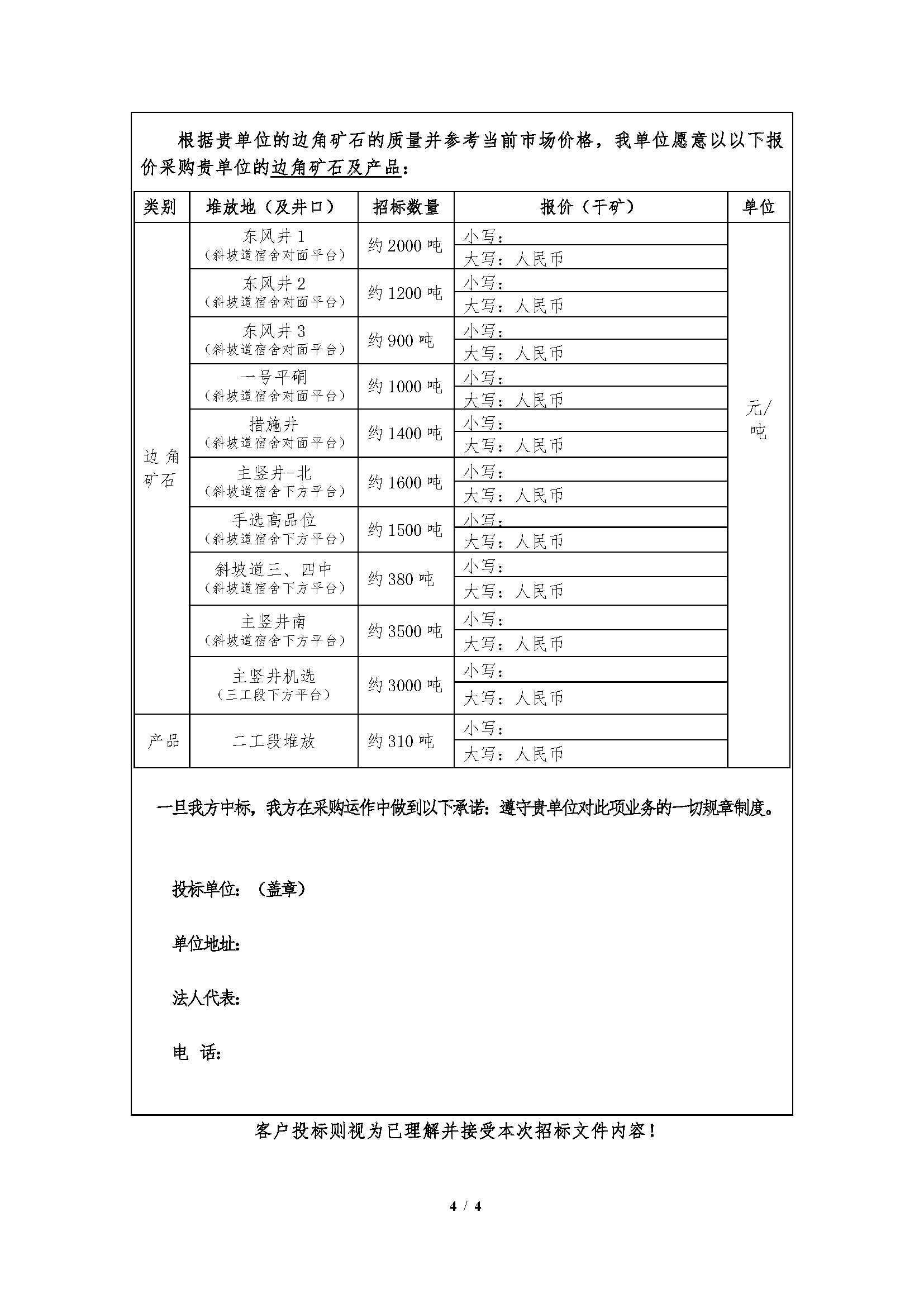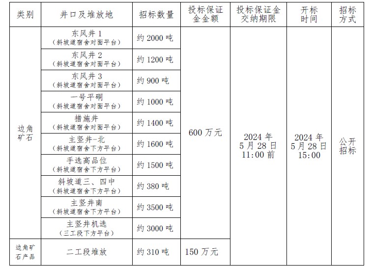 注:本次招標(biāo)產品數量為預估(gū)數,投標按幹礦報價,中標結算(suàn)濕礦以實際過磅數為準,水分按2%扣除計算幹(gàn)礦;邊角(jiǎo)礦石產品水(shuǐ)分由(yóu)中標人及我公司相關科室、車間人員現場(chǎng)取樣、我公司化驗的水分(fèn)數據為(wéi)準。如中標人需要,我公司開具甘肅省增值稅普通發票(黃金)。