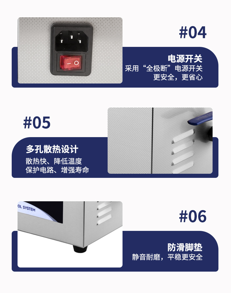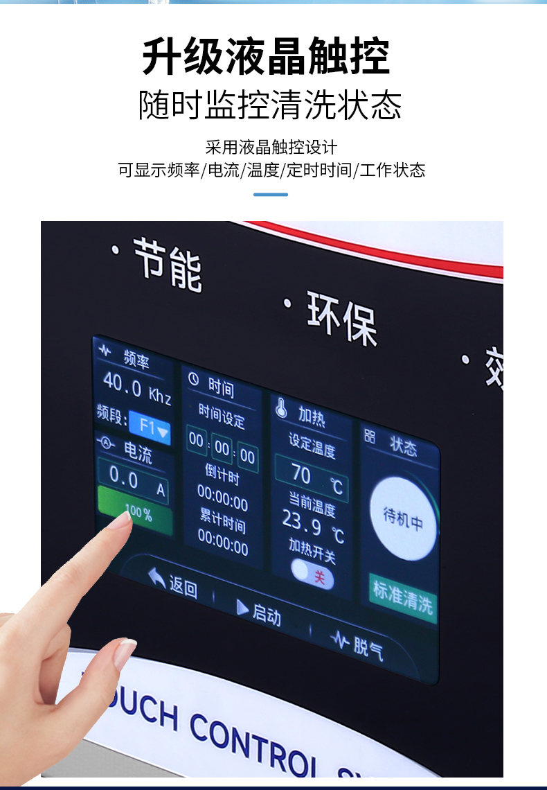 液晶觸控設計,工作狀態清晰可見。SUS304不鏽鋼一次性衝壓成型,無焊接處,厚度可達1.0MM(實測底部厚度)經久耐用。大功率工業級震(zhèn)動芯(xīn)片,空化效應強度高打釘+烤膠雙重(chóng)固定/性能穩定(dìng)壽命長。多種(zhǒng)清洗模式(shì),一鍵脫氣功能鍵。