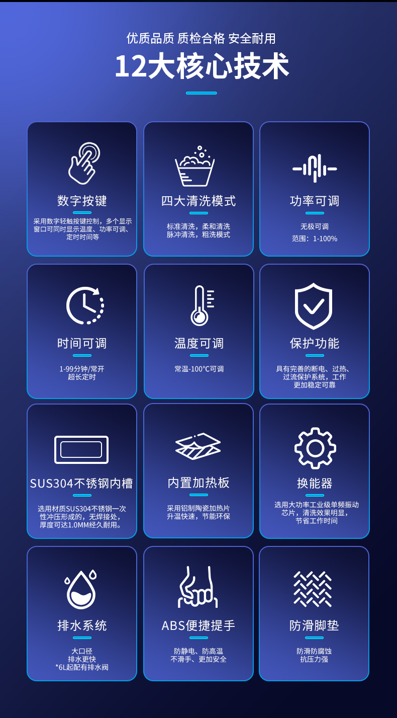 功率可(kě)調,線路板采用它激(jī)式微電腦控製下的數字頻率合成技術(shù),自動頻率跟蹤掃頻,數控百(bǎi)分比功率調節(1%-100%)。純銅線機芯,高溫不燒機。大功率工業級震動芯片,空化效應強度高打釘+烤膠雙重固定/性能穩定壽命長